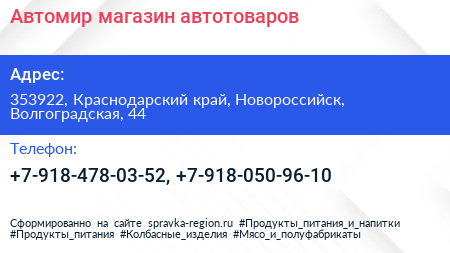 Автомир, магазин автотоваров по адресу 353922, Краснодарский край, Новороссийск, Волгоградская, 44 в дальнейшем Организация, размещена в следующих категориях: