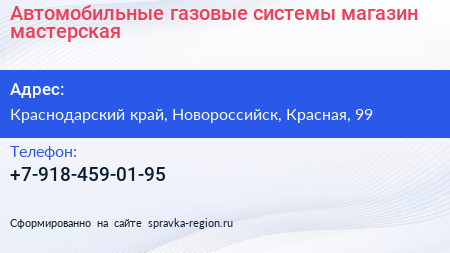 Автомобильные газовые системы, магазин-мастерская по адресу Краснодарский край, Новороссийск, Красная, 99 в дальнейшем Организация, размещена в следующих категориях: