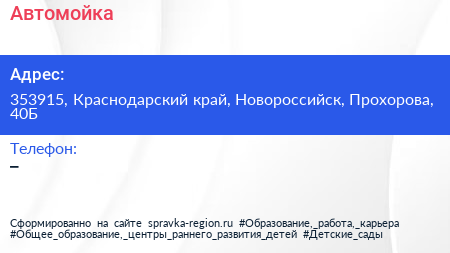 Автомойка по адресу 353915, Краснодарский край, Новороссийск, Прохорова, 40Б в дальнейшем Организация, размещена в следующих категориях: