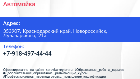 Автомойка по адресу 353907, Краснодарский край, Новороссийск, Луначарского, 21а в дальнейшем Организация, размещена в следующих категориях: