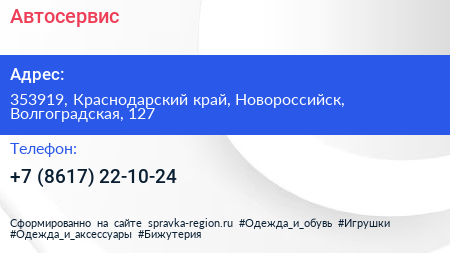 Автосервис по адресу 353919, Краснодарский край, Новороссийск, Волгоградская, 127 в дальнейшем Организация, размещена в следующих категориях: