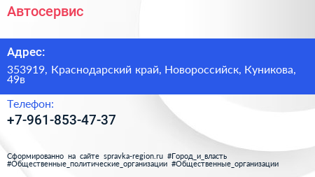 Автосервис по адресу 353919, Краснодарский край, Новороссийск, Куникова, 49в в дальнейшем Организация, размещена в следующих категориях:
