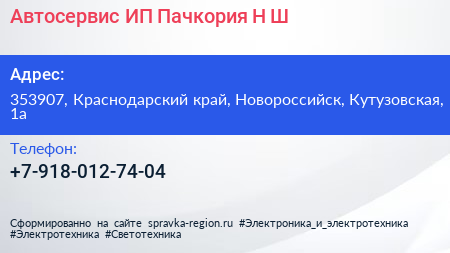 Автосервис, ИП Пачкория Н.Ш. по адресу 353907, Краснодарский край, Новороссийск, Кутузовская, 1а в дальнейшем Организация, размещена в следующих категориях: