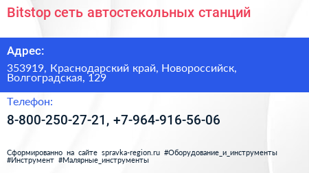 Bitstop, сеть автостекольных станций по адресу 353919, Краснодарский край, Новороссийск, Волгоградская, 129 в дальнейшем Организация, размещена в следующих категориях: