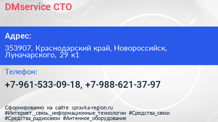DMservice, СТО по адресу 353907, Краснодарский край, Новороссийск, Луначарского, 29 к1 в дальнейшем Организация, размещена в следующих категориях: