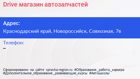 Drive, магазин автозапчастей по адресу Краснодарский край, Новороссийск, Совхозная, 7в в дальнейшем Организация, размещена в следующих категориях: