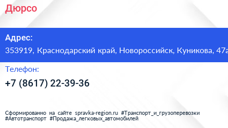 Дюрсо по адресу 353919, Краснодарский край, Новороссийск, Куникова, 47а в дальнейшем Организация, размещена в следующих категориях: