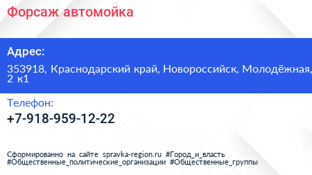 Форсаж, автомойка по адресу 353918, Краснодарский край, Новороссийск, Молодёжная, 2 к1 в дальнейшем Организация, размещена в следующих категориях:
