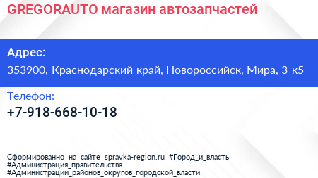 GREGORAUTO, магазин автозапчастей по адресу 353900, Краснодарский край, Новороссийск, Мира, 3 к5 в дальнейшем Организация, размещена в следующих категориях: