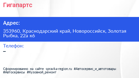 Гигапартс по адресу 353960, Краснодарский край, Новороссийск, Золотая Рыбка, 22а к6 в дальнейшем Организация, размещена в следующих категориях: