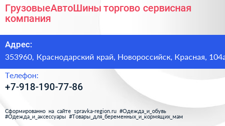ГрузовыеАвтоШины, торгово-сервисная компания по адресу 353960, Краснодарский край, Новороссийск, Красная, 104а в дальнейшем Организация, размещена в следующих категориях: