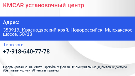 KMCAR, установочный центр по адресу 353919, Краснодарский край, Новороссийск, Мысхакское шоссе, 50/18 в дальнейшем Организация, размещена в следующих категориях: