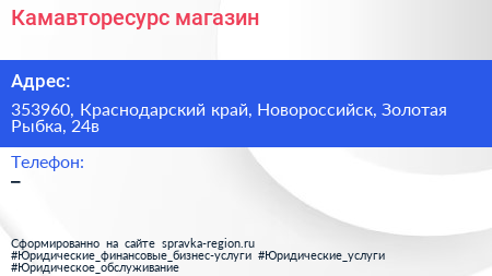 Камавторесурс, магазин по адресу 353960, Краснодарский край, Новороссийск, Золотая Рыбка, 24в в дальнейшем Организация, размещена в следующих категориях: