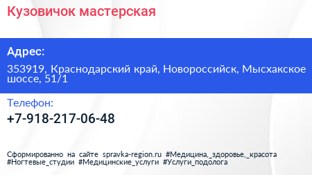 Кузовичок, мастерская по адресу 353919, Краснодарский край, Новороссийск, Мысхакское шоссе, 51/1 в дальнейшем Организация, размещена в следующих категориях: