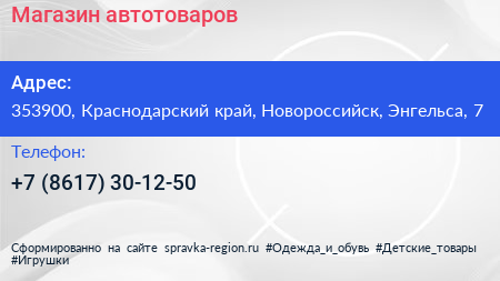 Магазин автотоваров по адресу 353900, Краснодарский край, Новороссийск, Энгельса, 7 в дальнейшем Организация, размещена в следующих категориях: