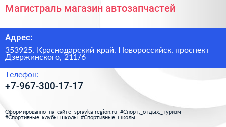Магистраль, магазин автозапчастей по адресу 353925, Краснодарский край, Новороссийск, проспект Дзержинского, 211/6 в дальнейшем Организация, размещена в следующих категориях: