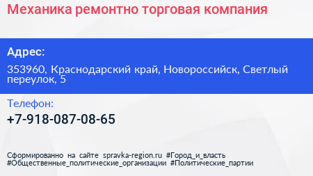 Механика, ремонтно-торговая компания по адресу 353960, Краснодарский край, Новороссийск, Светлый переулок, 5 в дальнейшем Организация, размещена в следующих категориях: