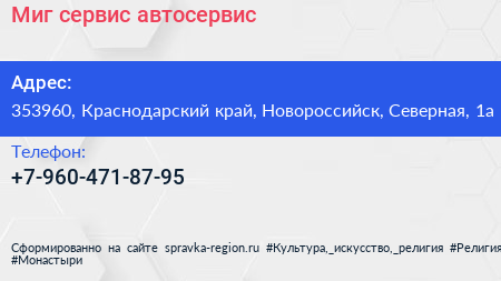 Миг сервис, автосервис по адресу 353960, Краснодарский край, Новороссийск, Северная, 1а в дальнейшем Организация, размещена в следующих категориях: