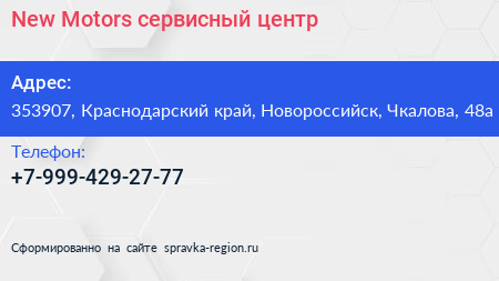 New Motors, сервисный центр по адресу 353907, Краснодарский край, Новороссийск, Чкалова, 48а в дальнейшем Организация, размещена в следующих категориях: