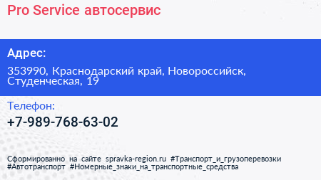 Pro Service, автосервис по адресу 353990, Краснодарский край, Новороссийск, Студенческая, 19 в дальнейшем Организация, размещена в следующих категориях: