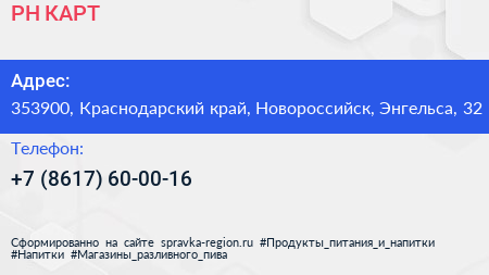 РН-КАРТ по адресу 353900, Краснодарский край, Новороссийск, Энгельса, 32 в дальнейшем Организация, размещена в следующих категориях: