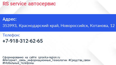RS service, автосервис по адресу 353993, Краснодарский край, Новороссийск, Котанова, 12 в дальнейшем Организация, размещена в следующих категориях: