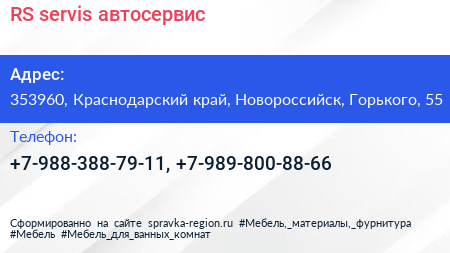 RS-servis, автосервис по адресу 353960, Краснодарский край, Новороссийск, Горького, 55 в дальнейшем Организация, размещена в следующих категориях: