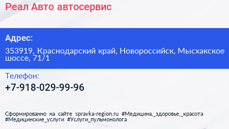 Реал-Авто, автосервис по адресу 353919, Краснодарский край, Новороссийск, Мысхакское шоссе, 71/1 в дальнейшем Организация, размещена в следующих категориях: