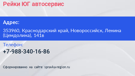 Рейки-ЮГ, автосервис по адресу 353960, Краснодарский край, Новороссийск, Ленина (Цемдолина), 141в в дальнейшем Организация, размещена в следующих категориях: