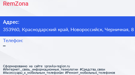 RemZona по адресу 353960, Краснодарский край, Новороссийск, Черничная, 8 в дальнейшем Организация, размещена в следующих категориях: