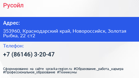 Русойл по адресу 353960, Краснодарский край, Новороссийск, Золотая Рыбка, 22 ст2 в дальнейшем Организация, размещена в следующих категориях: