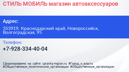 СТИЛЬ-МОБИЛЬ, магазин автоаксессуаров по адресу 353919, Краснодарский край, Новороссийск, Волгоградская, 95 в дальнейшем Организация, размещена в следующих категориях: