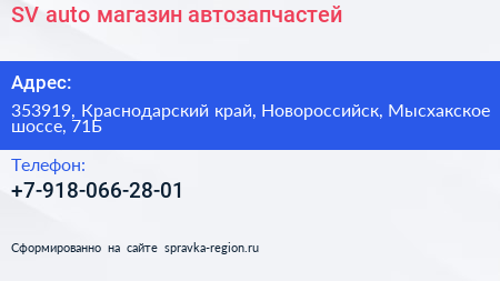 SV-auto, магазин автозапчастей по адресу 353919, Краснодарский край, Новороссийск, Мысхакское шоссе, 71Б в дальнейшем Организация, размещена в следующих категориях: