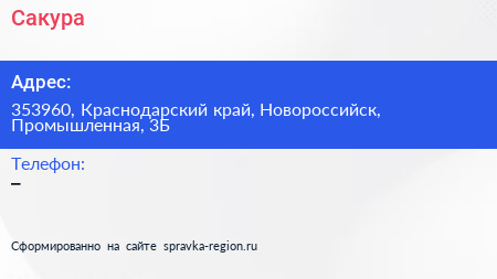 Сакура по адресу 353960, Краснодарский край, Новороссийск, Промышленная, 3Б в дальнейшем Организация, размещена в следующих категориях: