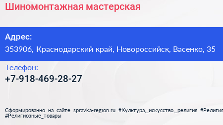 Шиномонтажная мастерская по адресу 353906, Краснодарский край, Новороссийск, Васенко, 35 в дальнейшем Организация, размещена в следующих категориях: