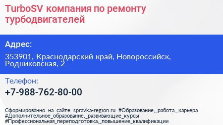 TurboSV, компания по ремонту турбодвигателей по адресу 353901, Краснодарский край, Новороссийск, Родниковская, 2 в дальнейшем Организация, размещена в следующих категориях: