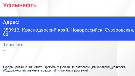 Уфимнефть по адресу 353913, Краснодарский край, Новороссийск, Суворовская, 81 в дальнейшем Организация, размещена в следующих категориях:
