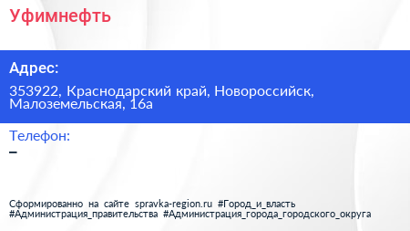 Уфимнефть по адресу 353922, Краснодарский край, Новороссийск, Малоземельская, 16а в дальнейшем Организация, размещена в следующих категориях: