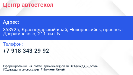Центр автостекол по адресу 353925, Краснодарский край, Новороссийск, проспект Дзержинского, 211 лит Б в дальнейшем Организация, размещена в следующих категориях: