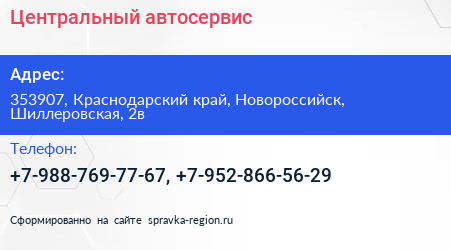 Центральный, автосервис по адресу 353907, Краснодарский край, Новороссийск, Шиллеровская, 2в в дальнейшем Организация, размещена в следующих категориях: