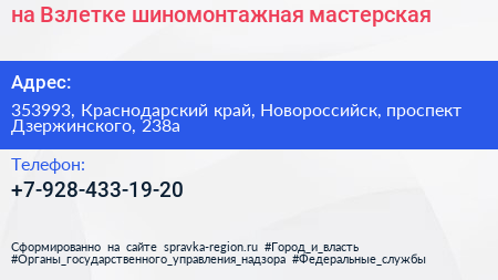 на Взлетке, шиномонтажная мастерская по адресу 353993, Краснодарский край, Новороссийск, проспект Дзержинского, 238а в дальнейшем Организация, размещена в следующих категориях: