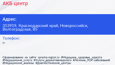 АКБ центр по адресу 353919, Краснодарский край, Новороссийск, Волгоградская, 85 в дальнейшем Организация, размещена в следующих категориях: