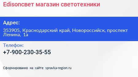 Edisonсвет, магазин светотехники по адресу 353905, Краснодарский край, Новороссийск, проспект Ленина, 1а в дальнейшем Организация, размещена в следующих категориях: