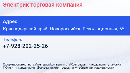 Электрик, торговая компания по адресу Краснодарский край, Новороссийск, Революционная, 55 в дальнейшем Организация, размещена в следующих категориях: