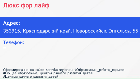 Люкс фор лайф по адресу 353915, Краснодарский край, Новороссийск, Энгельса, 55 в дальнейшем Организация, размещена в следующих категориях: