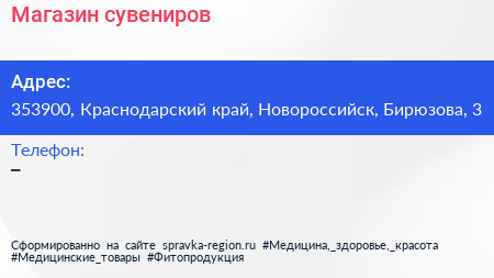 Магазин сувениров по адресу 353900, Краснодарский край, Новороссийск, Бирюзова, 3 в дальнейшем Организация, размещена в следующих категориях: