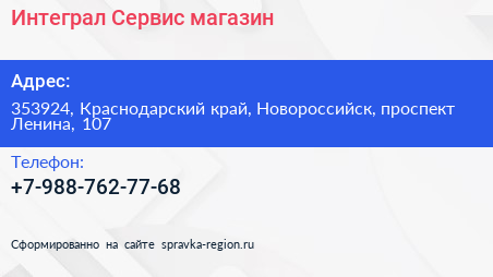 Интеграл-Сервис, магазин по адресу 353924, Краснодарский край, Новороссийск, проспект Ленина, 107 в дальнейшем Организация, размещена в следующих категориях: