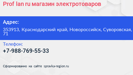 Prof-lan.ru, магазин электротоваров по адресу 353913, Краснодарский край, Новороссийск, Суворовская, 71 в дальнейшем Организация, размещена в следующих категориях: