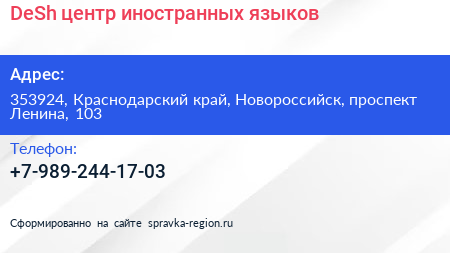 DeSh, центр иностранных языков по адресу 353924, Краснодарский край, Новороссийск, проспект Ленина, 103 в дальнейшем Организация, размещена в следующих категориях: