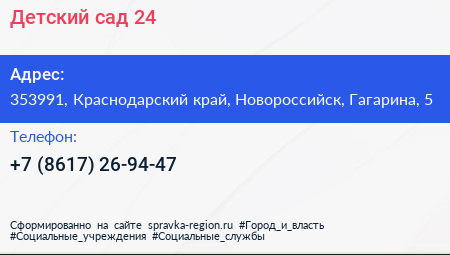 Детский сад №24 по адресу 353991, Краснодарский край, Новороссийск, Гагарина, 5 в дальнейшем Организация, размещена в следующих категориях: